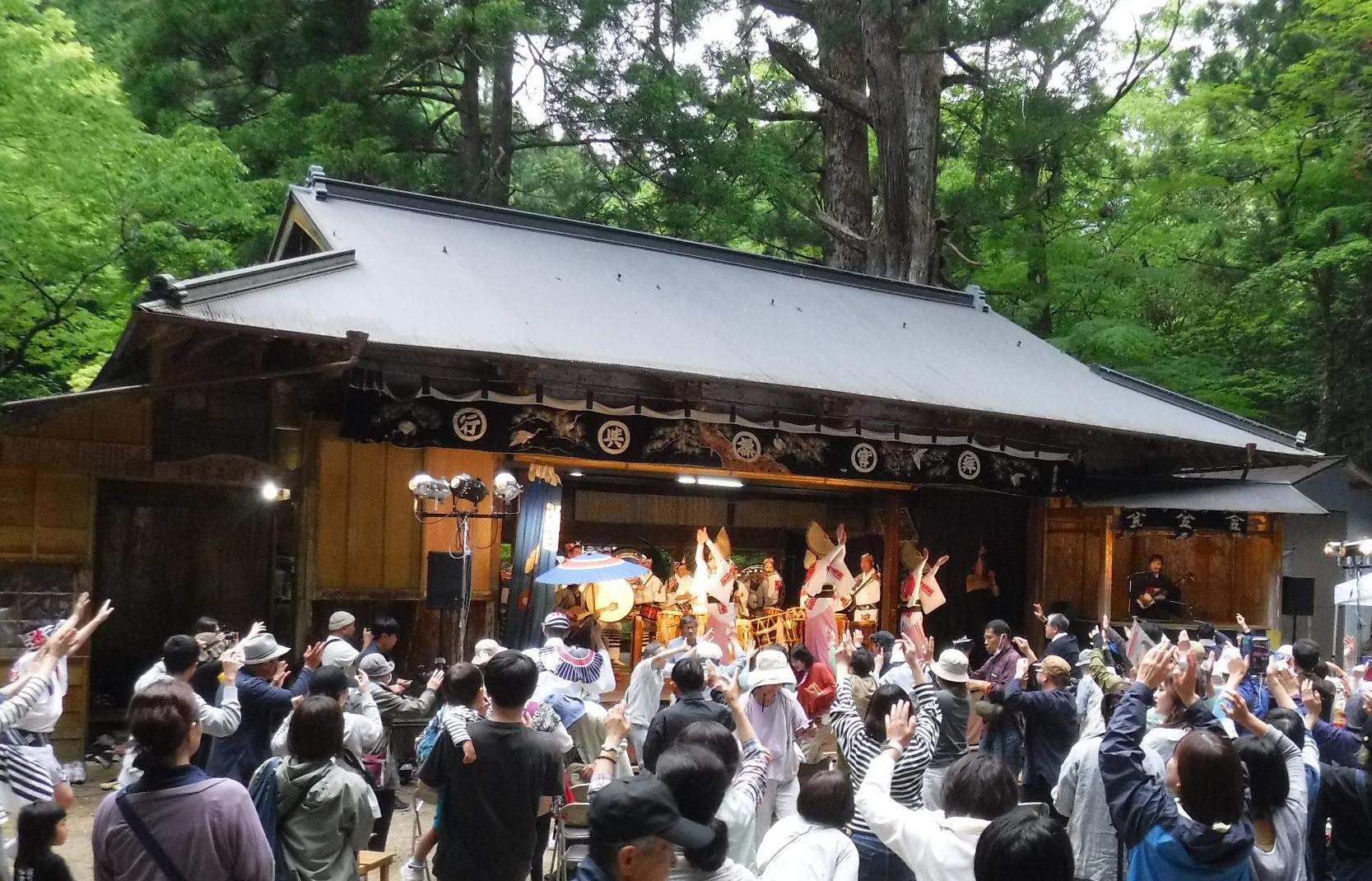 せせらぎと野山の緑、白人神社境内の神聖な空気に包まれた農村舞台へぜひお越しください。