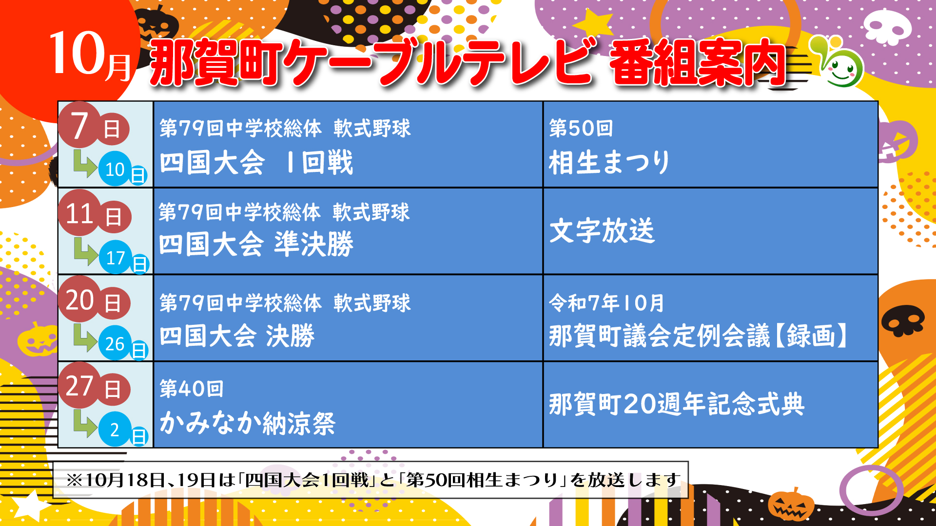 10月11日からの「令和7年10月那賀町議会定例会議録画放送」は、文字放送に変更いたします。録画放送は10月20日から26日に行います。詳しい放送時間はリモコンの番組表をご覧ください。
