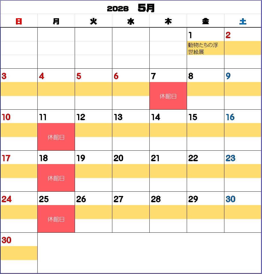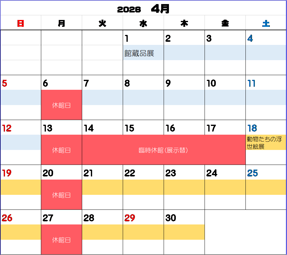 4月18日(土)~6月14日(日)まで、春の企画展『動物たちの浮世絵展』開催により、一般(高校生以上)の入館料を550円とさせていただきます。※会期中は、当館所蔵作品はご覧いただけません